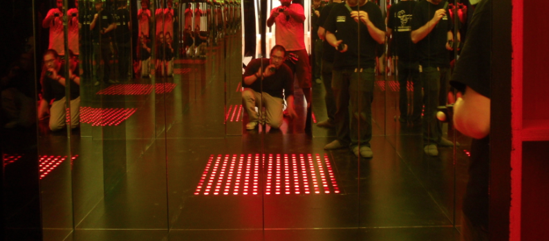 Norm: One of the main challenges we faced were reflections! There were reflective surfaces everywhere. All the walls in the hallways and rooms, the giant piece of glass that was between Barry Nyle and Elena in the therapy room, the infinity-mirrored Sentinaut room, Margo's giant glasses, just everywhere. Sometimes it was very difficult to hide ourselves shooting very perpendicular and straight on into wall surfaces. You would often see the camera assistant, the dolly grip, myself, and the camera and dolly hiding under a sheet of duvatyne. It was easier when the camera was static but if there was any movement, we had to be very careful. I became very paranoid of being in any reflection that I may have not noticed in the viewfinder or the fuzzy video tap from the film camera.